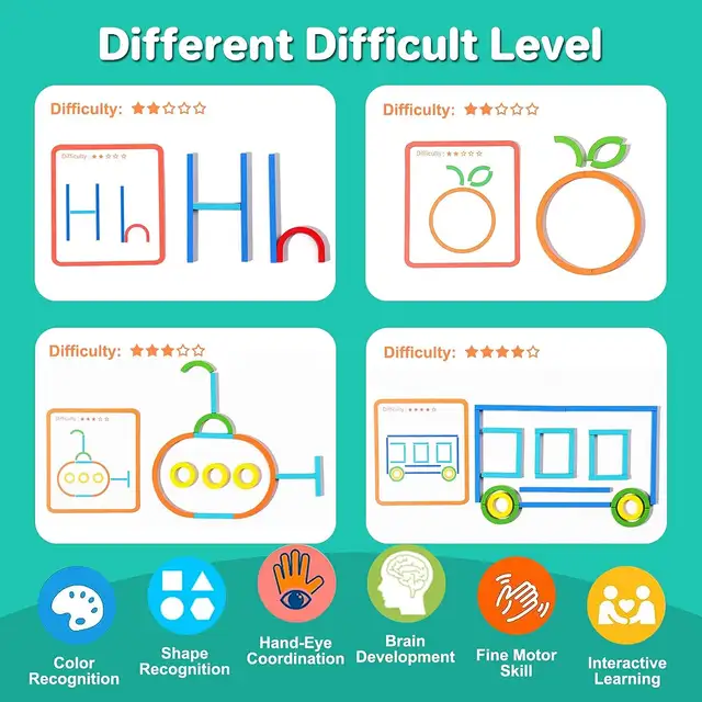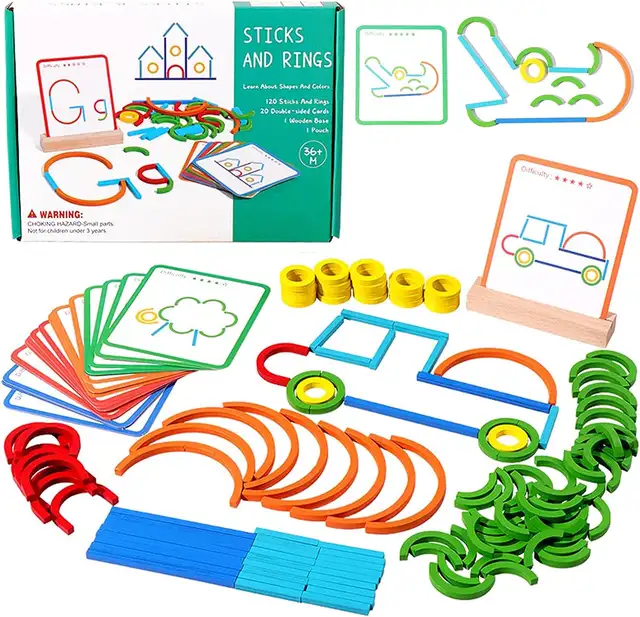 این بازی 120 قطعه ی چوبی در به شکل های میله ای و حلقه ای و 20 عددکارت الگوی تصویری دو طرفه دارد که کودکان می توانند برای ایده گرفتن از این الگوها استفاده کنند. اما به طور کلی بازی با ساختنی چوبی میله و حلقه یک بازی کاملا خلاقانه بر پایه ی تصویرسازی های ذهنی کودکان است که می تواند هوش و خلاقیت کودکان بالای سه سال را پرورش دهد.