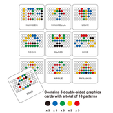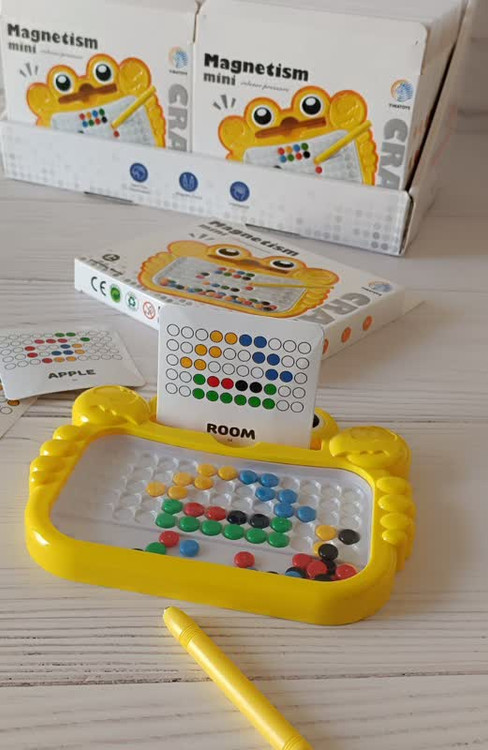 یک قلم آهنربایی و تعداد زیادی کارت الگوی طراحی همراه این برد وجود دارد . روش بازی به این صورت است که کودکان مهره های رنگی را با استفاده از قلم آهنربایی جا به جا می کنند و هر مهره را در جای خود با خلاقیت برای ساختن طرح دلخواه قرار می دهند یا از الگوها برای تقویت مهارت الگو خوانی و تصویرسازی استفاده می کنند.