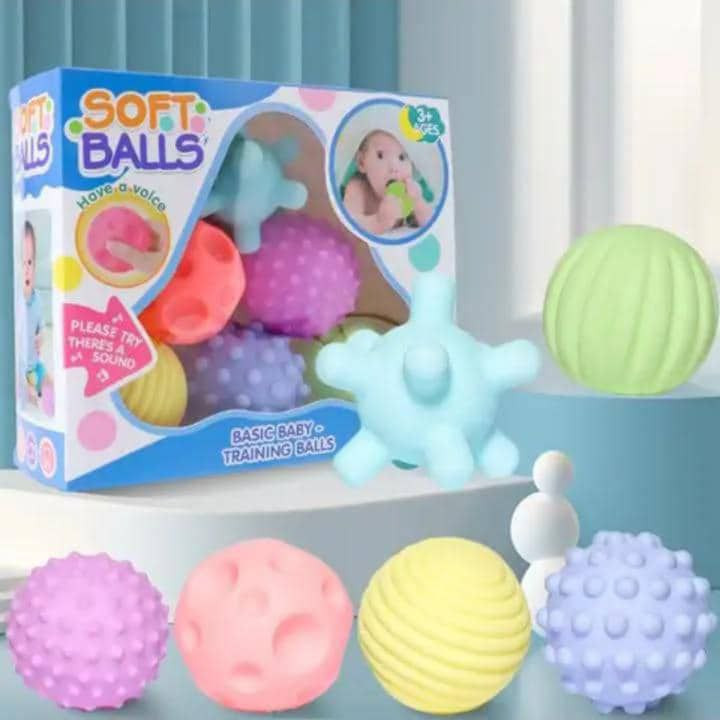 توپ های حسی برای تقویت حواس کودک و ایجاد تحریکات پوستی نوزادان و ماساژ استفاده می شوند و می توانند نه تنها باعث ایجاد حس آرامش در کودک بلکه باعث تقویت حواس کودک شوند و حتی در زمینه فعال کردن بخش گفتاری کودک هم نقش موثری دارند. این پک شامل 6 عدد توپ با بافت ها و رنگ های مختلف است که همه کاملا نرم و ایمن هستند و قابلیت ضدعفونی کردن در آب جوش دارند. هر توپ یک سوت هم دارد که می تواند هنگام بازی کودک شنوایی وی را نیز درگیر کند.