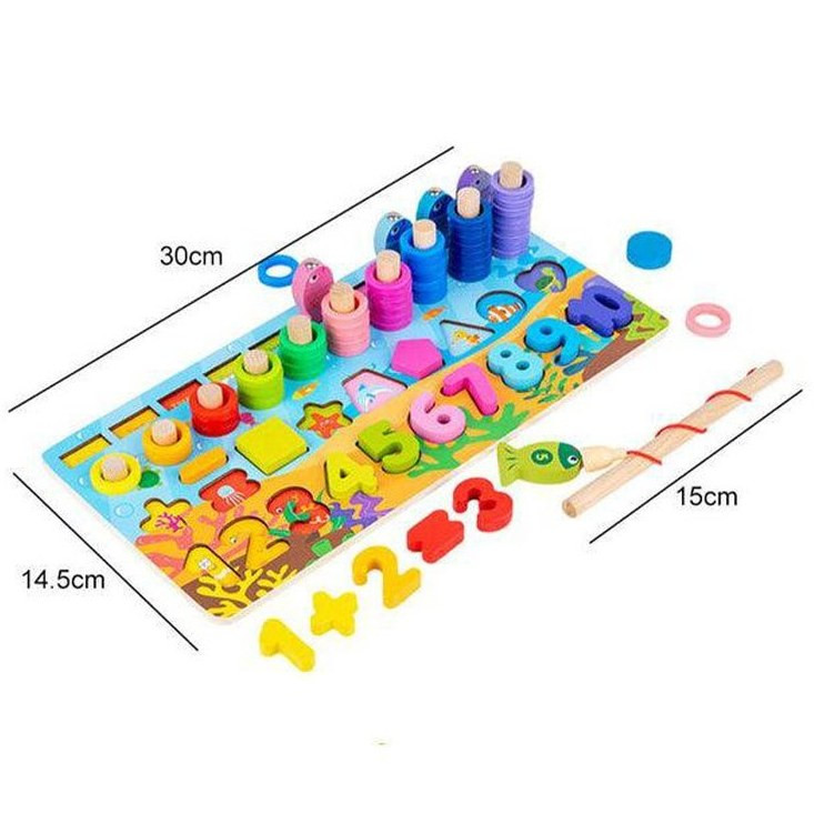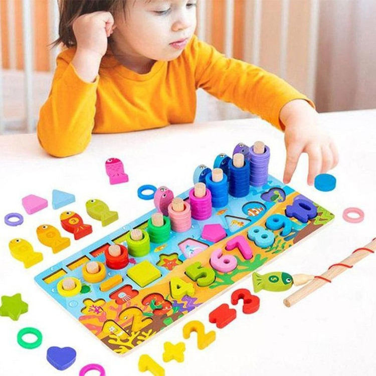 بازی ماهیگیری چوبی که در بالای صفحه قرار دارد، یکی از بازیهای محبوب و دستورزی کودکان در صفحه مونته سوری آموزش اعداد و اشکال(۴۱ قطعه) است، که میتواند به افزایش دقت و تمرکز آنها کمک کند و باعث هماهنگی چشم و دست شود. روی ماهیهای چوبی رنگی، از یک طرف، عدد هم نوشته شده است که میتوانید به همراه ماهیگیری کردن به کودک اعداد را هم یاد دهید، همچنین رنگها را نیز به همین شکل.