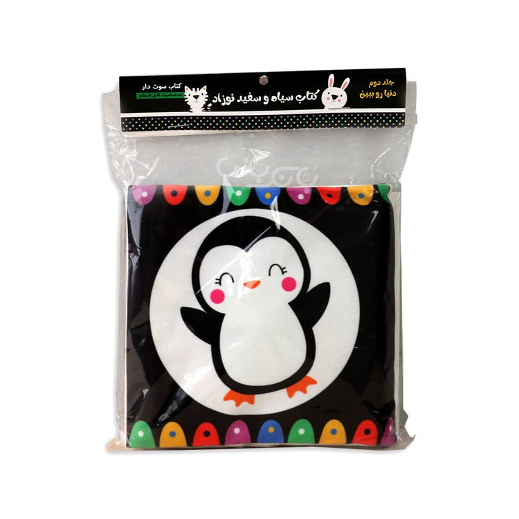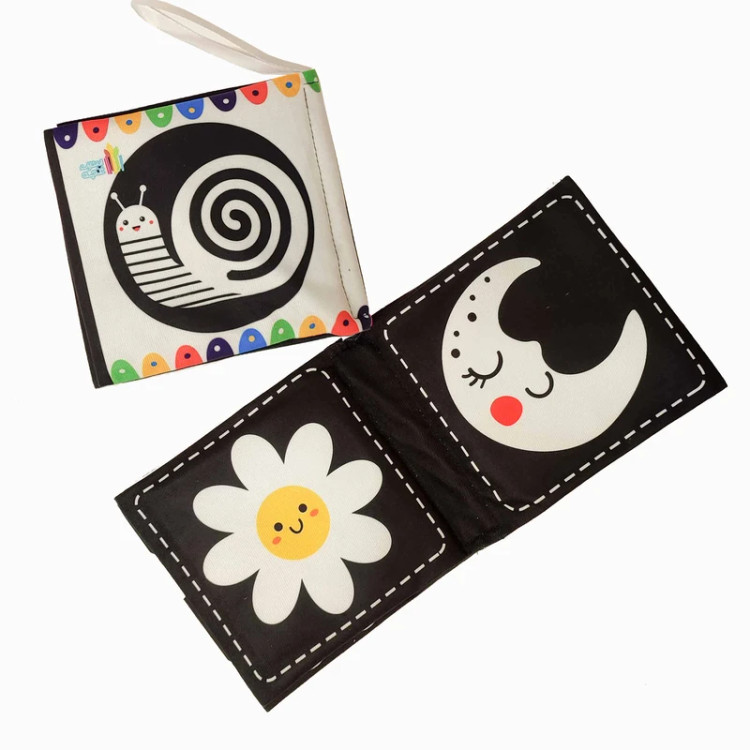 کتاب های پارچه ای سیاه و سفید شامل دو جلد کتاب پارچه ای دنیارو ببین و چشماتو واکن هست. کتاب سیاه و سفید نوزاد برای نوزاد از محبوبترین و کاربردیترین ابزارهایی است که میتوانیم برای نوزادان تهیه کنیم. چرا؟ نوزاد از تولد و در شکم مادر، میتواند نور و تاریکی را از هم تشخیص بدهد. اما هنگامی که به دنیا میآید، دید جانبی دارد. یعنی میتواند دامنه نقاط را ببیند و نمیتواند روی یک نقطه تمرکز کند. نوزاد تا یک ماهگی میتواند چیزهایی را که در فاصله 20 تا 30 سانتیمتری هستند ببیند. بعد از یک ماهگی این فاصله کمکم بیشتر شده و به 90 سانتیمتری میرسد .در حدود دو ماهگی نوزاد میتواند چیزهای متحرک را دنبال کند؛ اما نگاهش هنوز ردیابی و تمرکز روی نقاط عمق کافی ندارد.