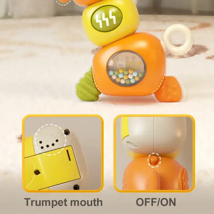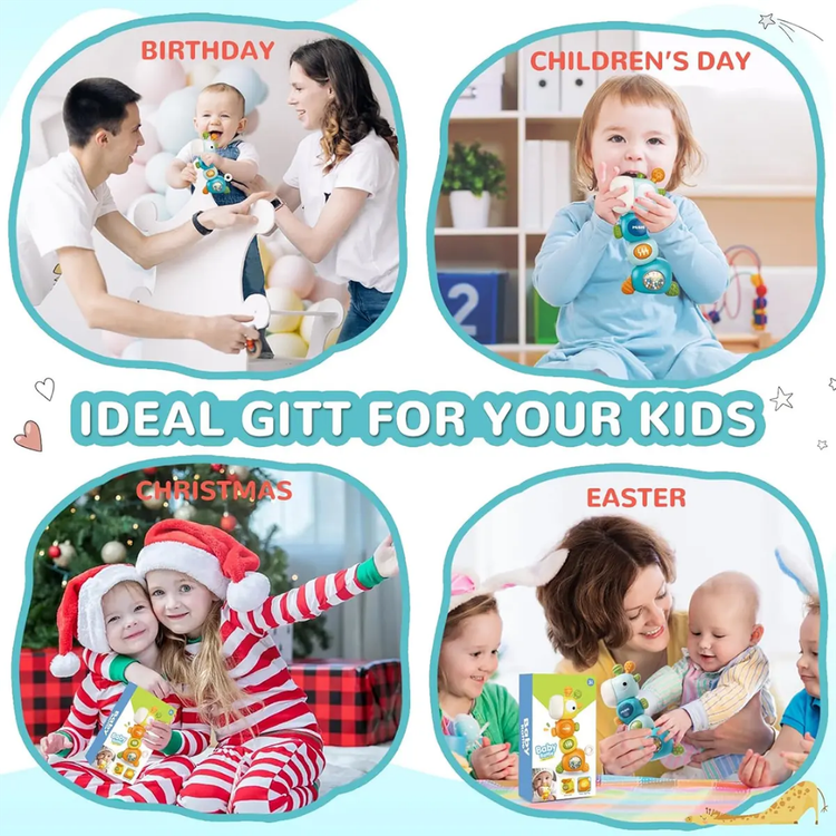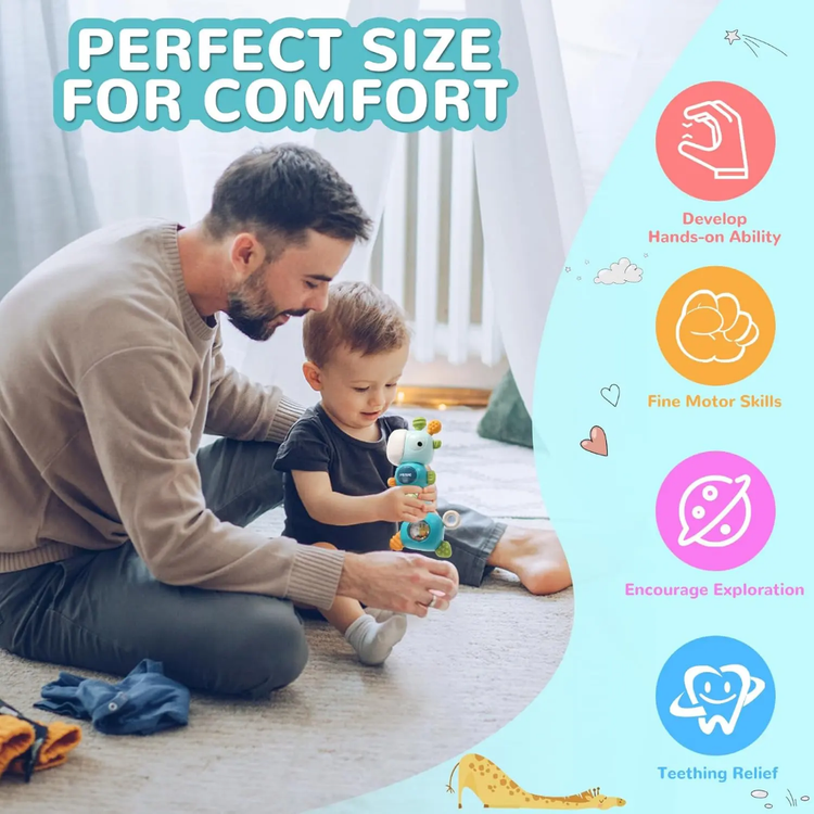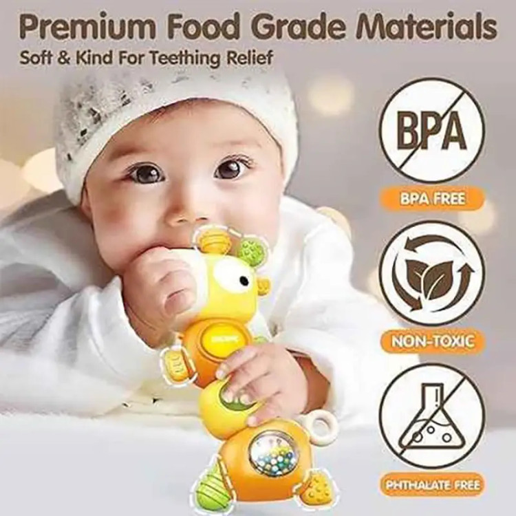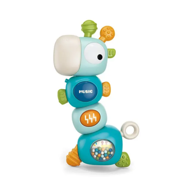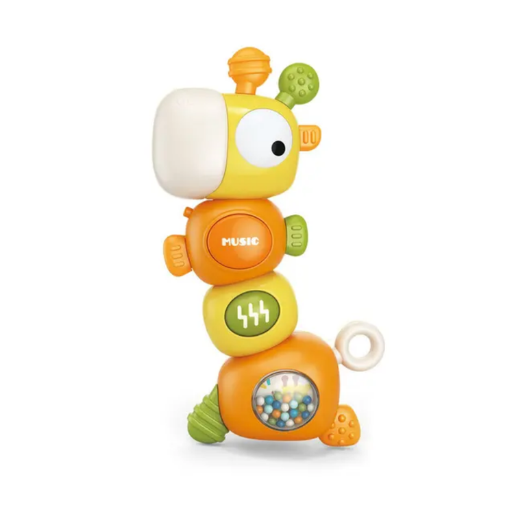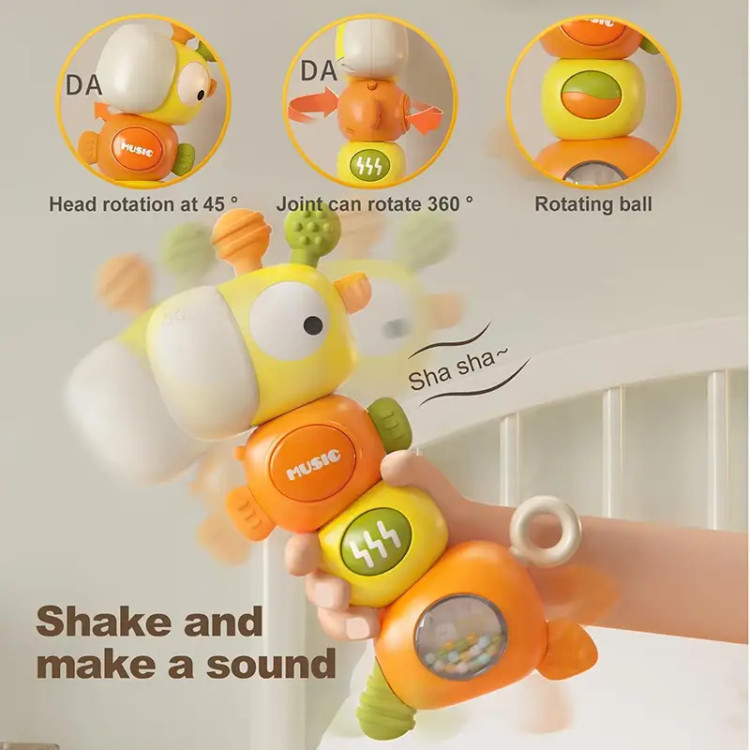 این هزارپا میتونه دوست خوب کوچولوی شما باشه! هم موزیکال و چراغدار، هم جغجغه داره و دندانگیر در قسمت گوش ها و بدنه! کاملا ایمن، با بازی ها مختلف که کوچولوها رو سرگرم میکنه. بدنه ای این زرافه 360 درجه می چرخه و صدایی تولید میکند که جالب توجه برای کودکان خردسال می باشد. جلوه ی نوری و موزیکال بودن این اسباب بازی زیر 2 سال مهارت کودکان در شناختن نور و رنگ ها کمک می کند و همچنین هوش موسیقیایی آنان را افزایش می دهد. جغجغه موجود در بدنه و بازی گردون در قسمت بر روی بدنه ی این زرافه ی بامزه نیز می تواند به تقویت مهارت و سرگرمی بیشتر کودکان کمک می کند. در بدنه و گوش های این اسباب بازی دخترانه و پسرانه نیز دندانگیر وجود دارد که کودک می تواند از آن استفاده کند و کاملا ایمن است اگر کودک شما بخواهد که اسباب بازی در دهان خود قرار دهد.