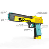 تفنگ دوکاره آب پاش و تیر پران طرح کلت شبیه کلت پلیس با دو قابلیت شلیک می باشد . یک کلت که در آن واحد هم می تواند یک تفنگ آبی باشد و هم قابلیت شلیک با تیرهای فومی را دارا می باشد. این اسباب بازی از جنس پلاستیک و مناسب برای کودکان بالای 3 سال است . دارای بسته بندی کارخانه ای بوده و در بسته به همراه کلت 10 عدد تیر از جنس فوم که بی خطر هستند موجود می باشد .