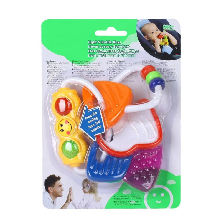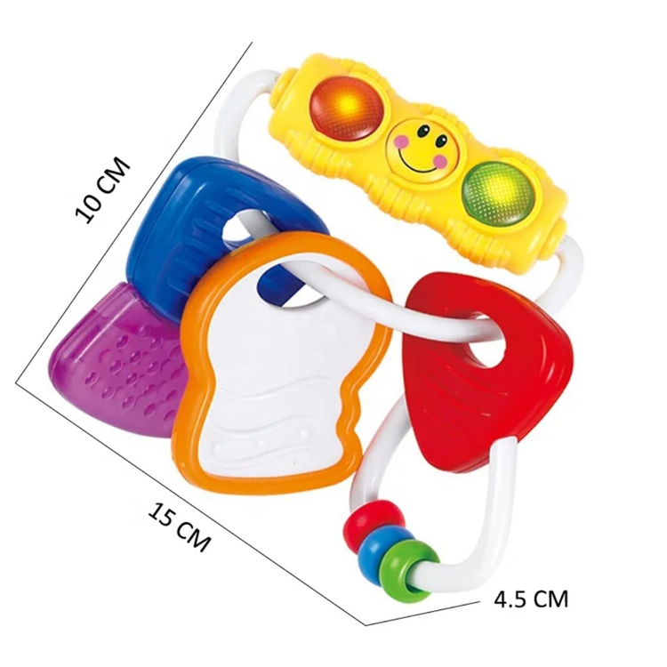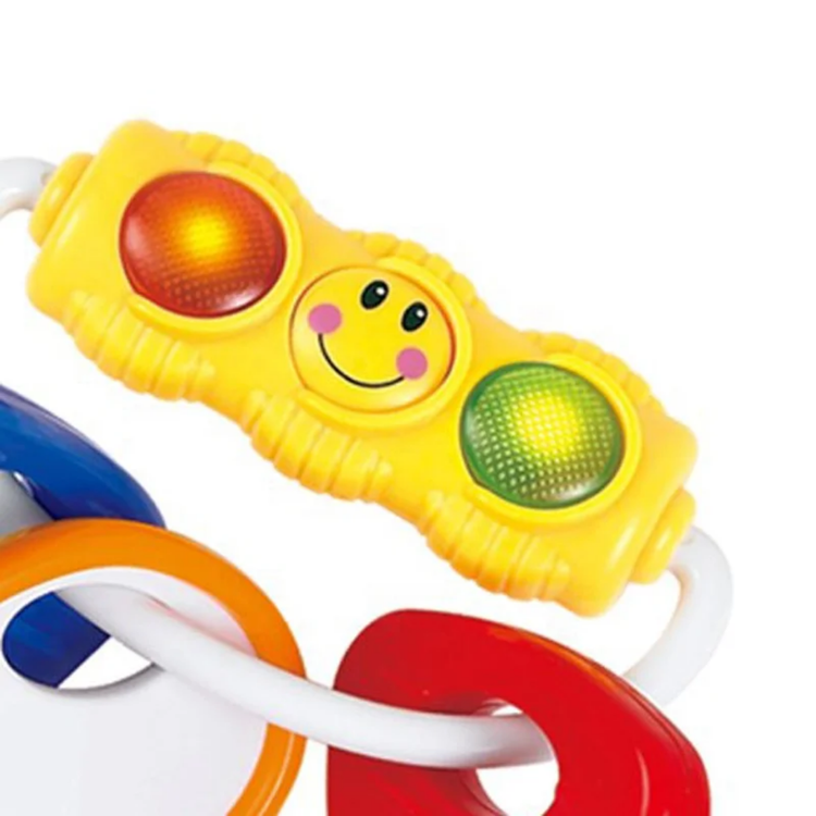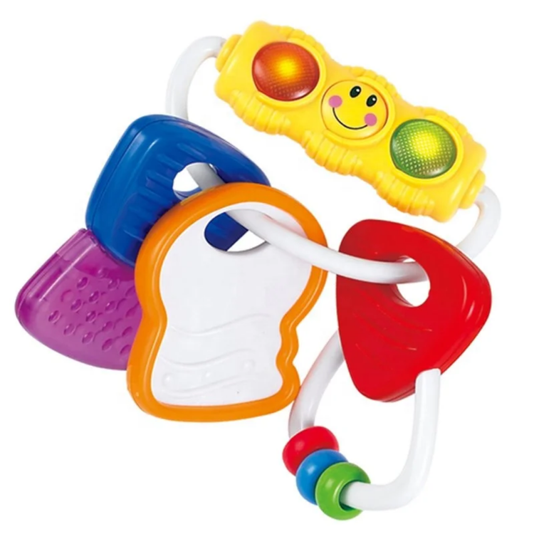 حلقه های رنگی به یکی از کلیدها آویزان است که با تکان دادن صدای جغجغه ای می دهد