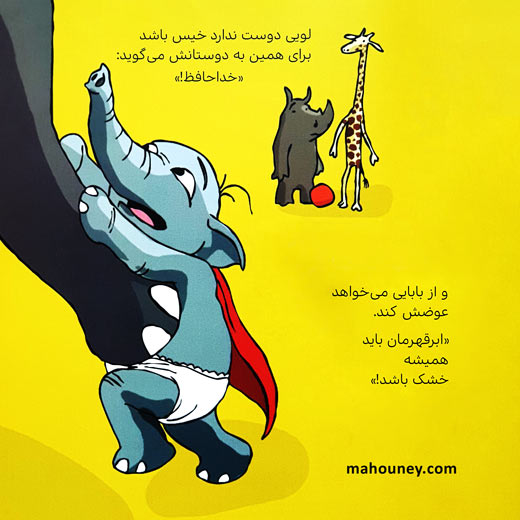 در کتاب لویی قهرمان شنلپوش، لویی، فیل بامزه و دوستداشتنی، در حین بازی با دوستانش متوجه میشود که اگر از پوشک بگذرد و شورت بپوشد، میتواند بیشتر بازی کند و در تاب سواری احساس سبکی کند. گرچه لویی از این تغییر میترسد، اما تصمیم میگیرد ترسش را کنار بگذارد و از پدر و مادرش بخواهد که دیگر برایش پوشک نبندند. این داستان به کودکان کمک میکند تا با تغییرات زندگی و بزرگ شدن راحتتر کنار بیایند.