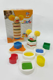 اسباب بازی فکری و آموزشی برج دلقک از قطعات هندسی رنگی به شکل های گل، ستاره، مربع، بیضی و پاپیون و 5 قطعه ی دایره ای که حفره هایی برای جاگذاری قطعات دارد ساخته شده و یک عروسک دلقک زیبا هم همراه این بازی هست که برروی برج قرار میگیرد.