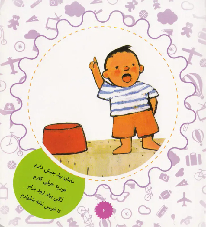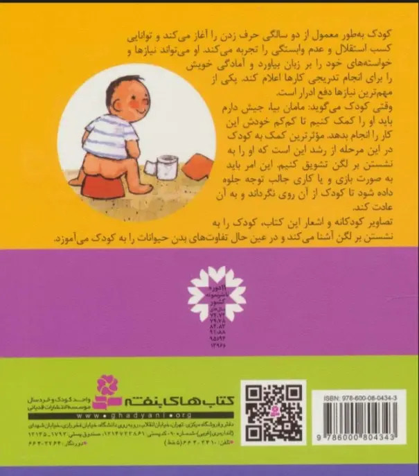 تصاویر کودکانه و اشعار این کتاب، کودک را به نشستن بر لگن آشنا میکند و در عین حال تفاوتهای بدن حیوانات را به کودک میآموزد