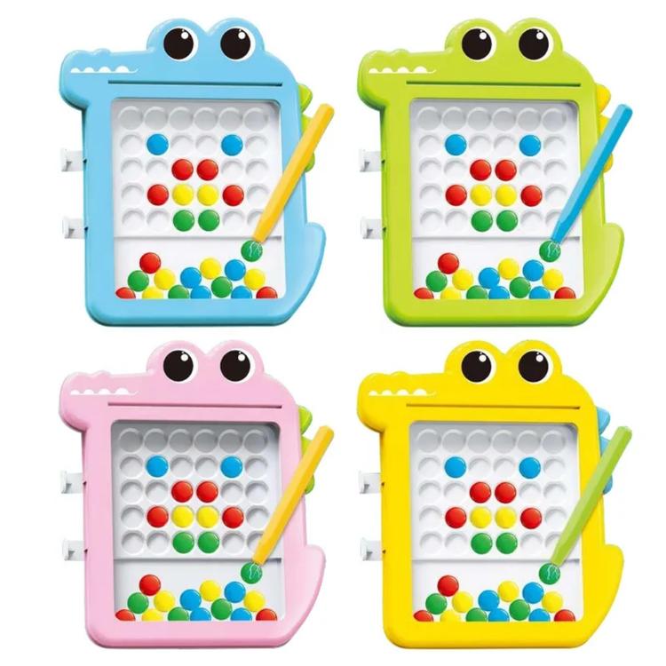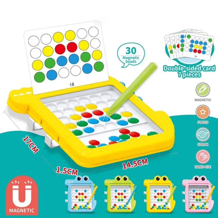 بازی برد مگنتی الگویابی و طراحی با دکمه های مغناطیسی مدل دایناسور یکی از بهترین بازی ها برای تقویت دقت و تمرکز، هماهنگی چشم و دست، پرورش خلاقیت و الگو یابی برای کودکان بالای سه سال است. این بازی دارای هفت عدد کارت الگو یابی دو رویه است که کودک می تواند بر طبق آن اشکالی را با استفاده از مداد آهنربایی و مهره های رنگی داخل صفحه بازی بسازد.