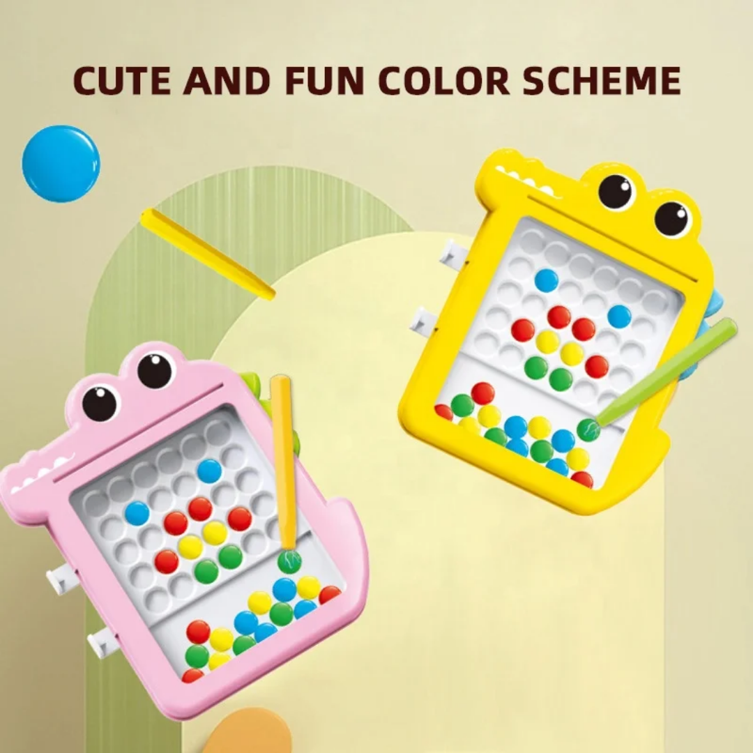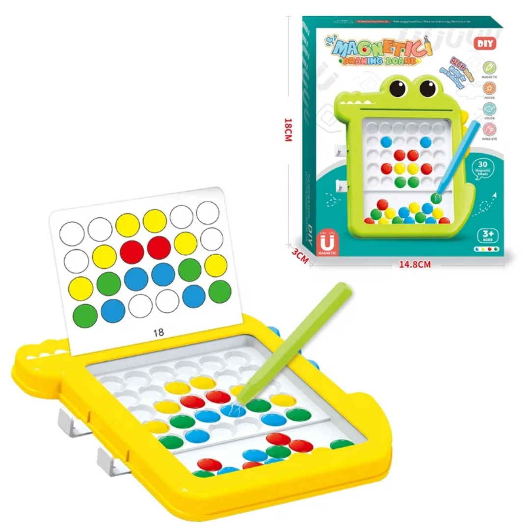 بازی برد مگنتی الگویابی و طراحی با دکمه های مغناطیسی مدل دایناسور یکی از بهترین بازی ها برای تقویت دقت و تمرکز، هماهنگی چشم و دست، پرورش خلاقیت و الگو یابی برای کودکان بالای سه سال است. این بازی دارای هفت عدد کارت الگو یابی دو رویه است که کودک می تواند بر طبق آن اشکالی را با استفاده از مداد آهنربایی و مهره های رنگی داخل صفحه بازی بسازد.