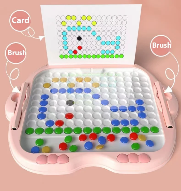 این محصول یک بازی فکری کودک است که با طراحی زیبا و دوستداشتنی خرگوش، قلب هر کودکی را تسخیر میکند. این تخته مغناطیسی با دهها مهره رنگی کوچک (که شما آن را دانه های شکلات مینامید) و یک قلم مخصوص، ابزاری بینظیر برای تبدیل ایدههای ذهنی کودک به واقعیتهای دیداری است. کودک شما با کمک نیروی مغناطیس، مهرهها را جابجا میکند و الگوهای روی کارتها را میسازد یا طرحهای کاملاً جدید خلق میکند. در واقع، این بازی یک بوم نقاشی بیپایان است که هرگز کثیف نمیشود و قطعات آن هرگز گم نخواهند شد.