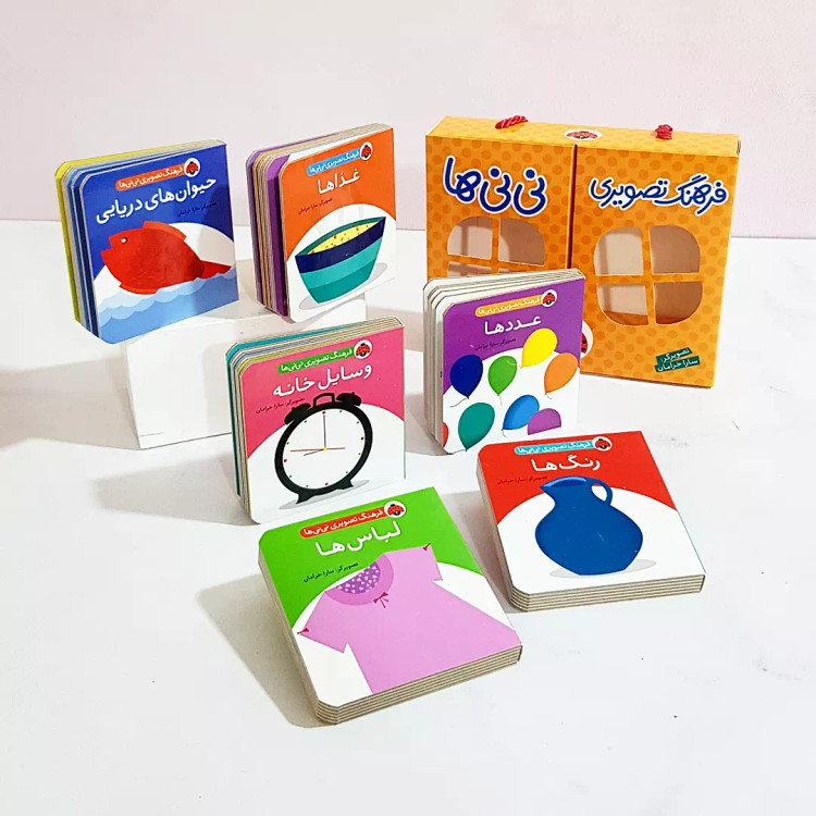جلد نارنجی:فرهنگ تصویری نینی ها کتابهایی کوچک هستند که کودکان زیر 3 سال را با محیط اطرافشان آشنا میکند. کوچولوهای شما با این کتابها کلمات انگلیسی را هم یاد میگیرند. این پک شامل کتاب های زیر است: لباسها، حیوانهای دریایی، رنگها، وسایل خانه، عددها، غذاها