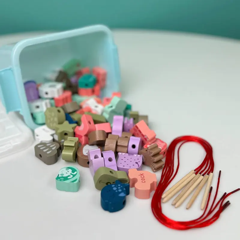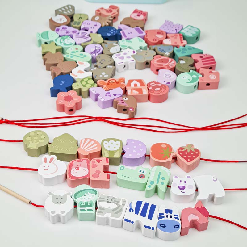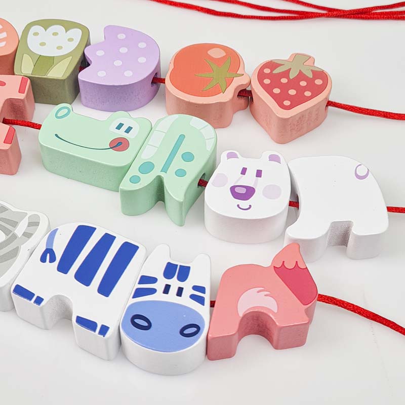 اسباب بازی چوبی نخ و مهره طرح حیوانات با هدف آموزش به کودک و شناخت حیوانات، اسامی آنها، املای کلملات و رنگها قابلیت چیدمان و نخ کردن حیوانات مختلف به سلیقه کودک برای آموزش حروف الفبای انگلیسی به کودک خود در هنگام بازی می باشد. یکی از بهترین بازی ها برای کودکان بالای سه سال بازی هایی هستند.