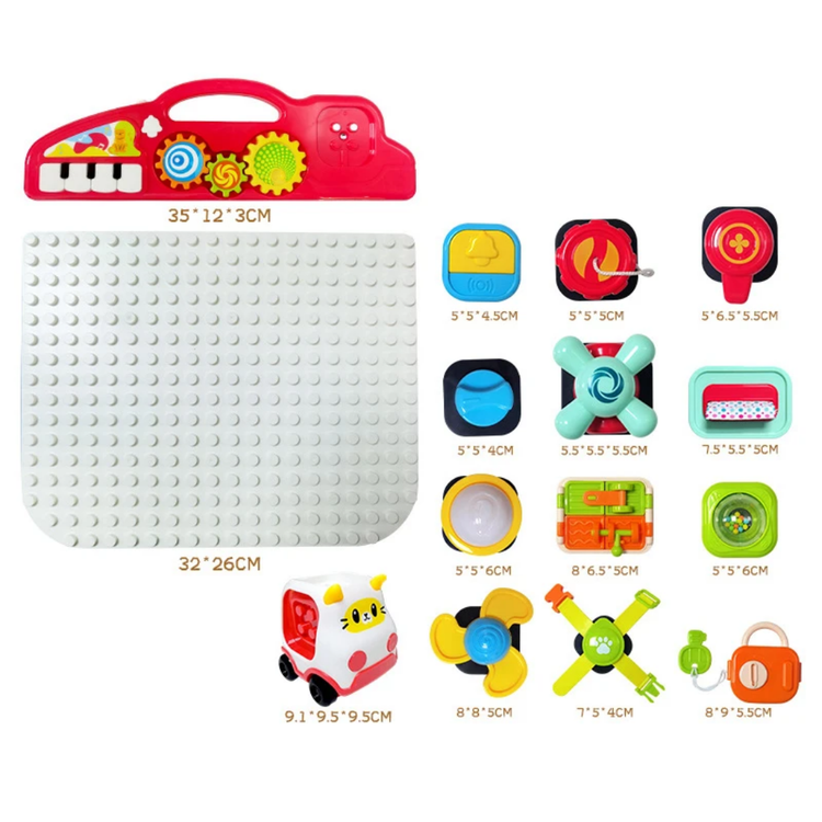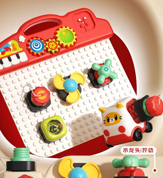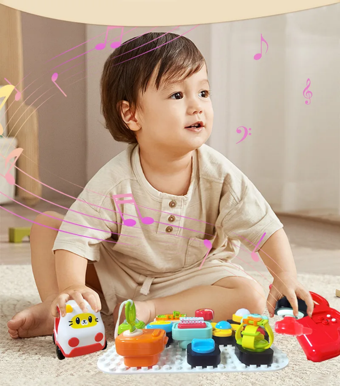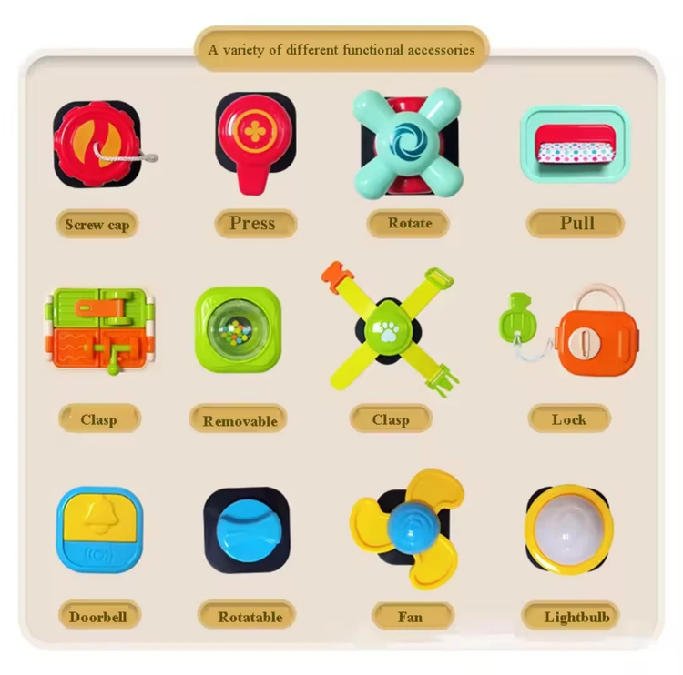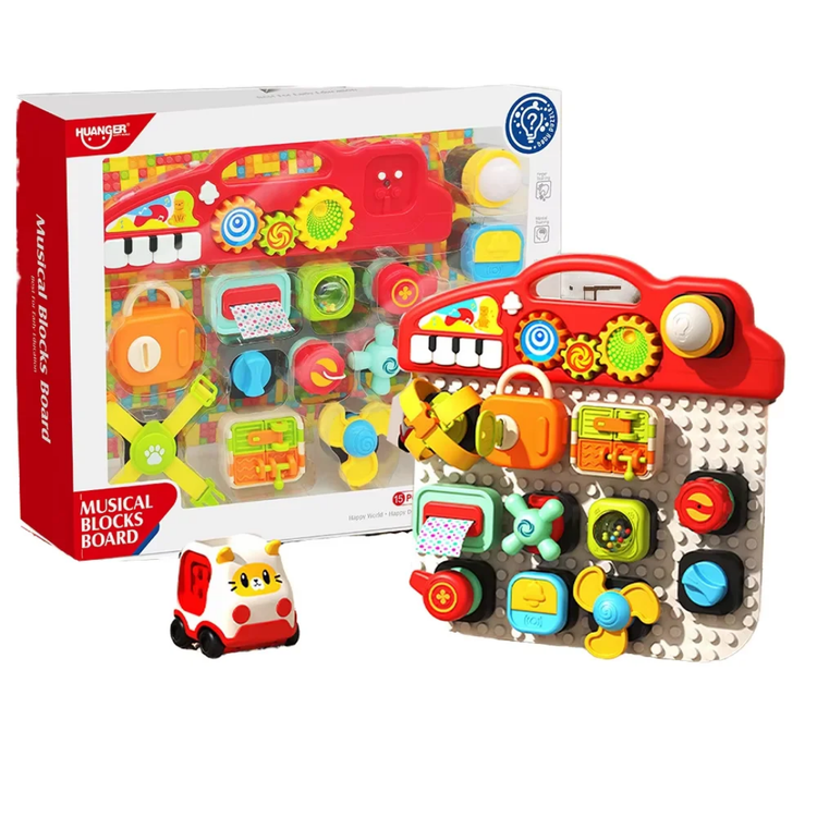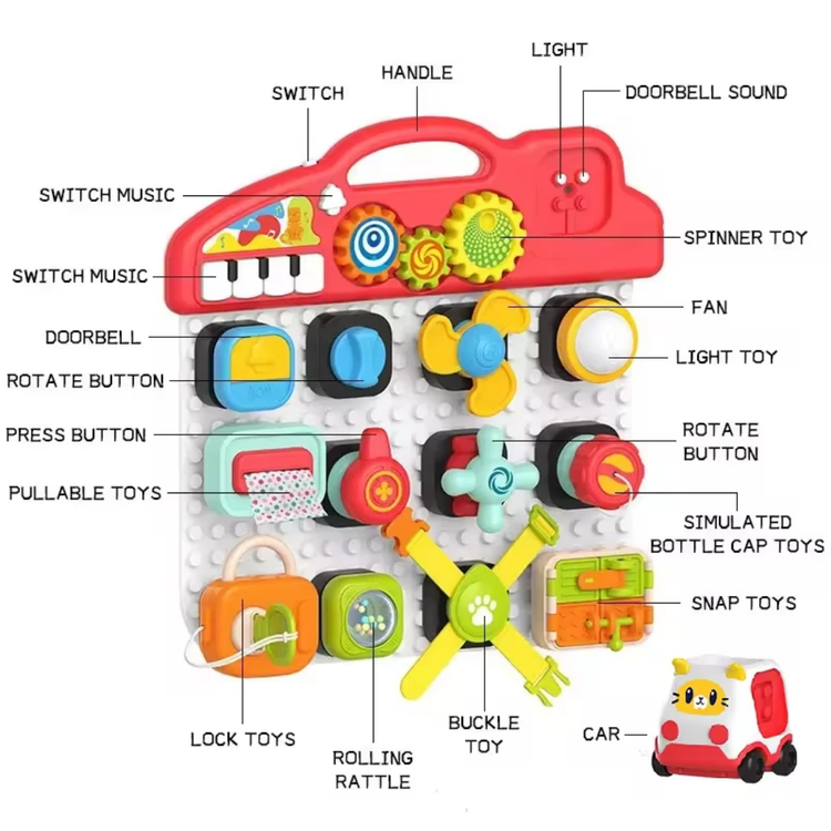 هر بلوک، یک بازی کوچک و جالب است! از لامپ و زنگ گرفته تا قفل و فرمان، همه و همه برای سرگرمی و یادگیری کودک طراحی شدهاند.