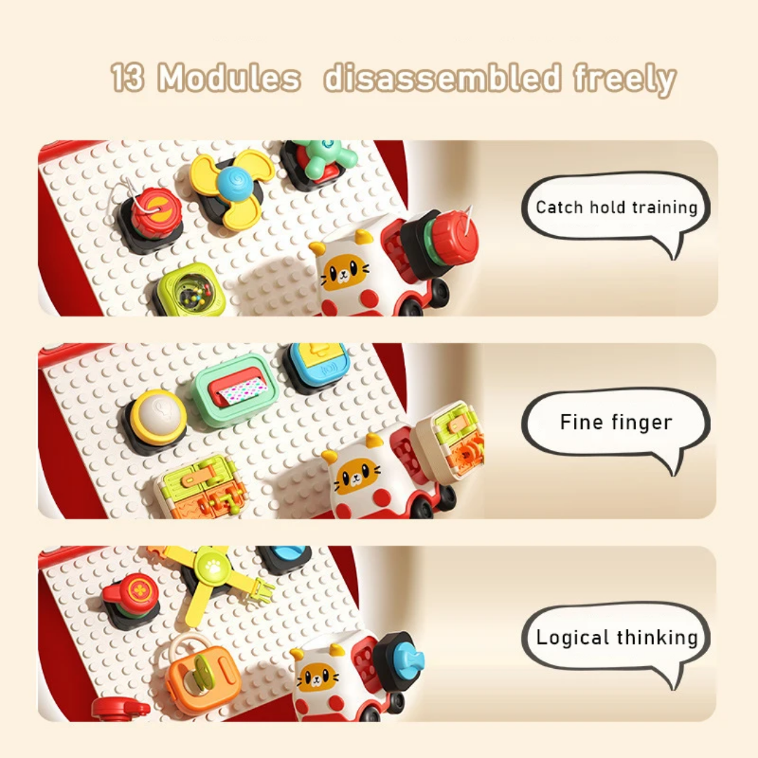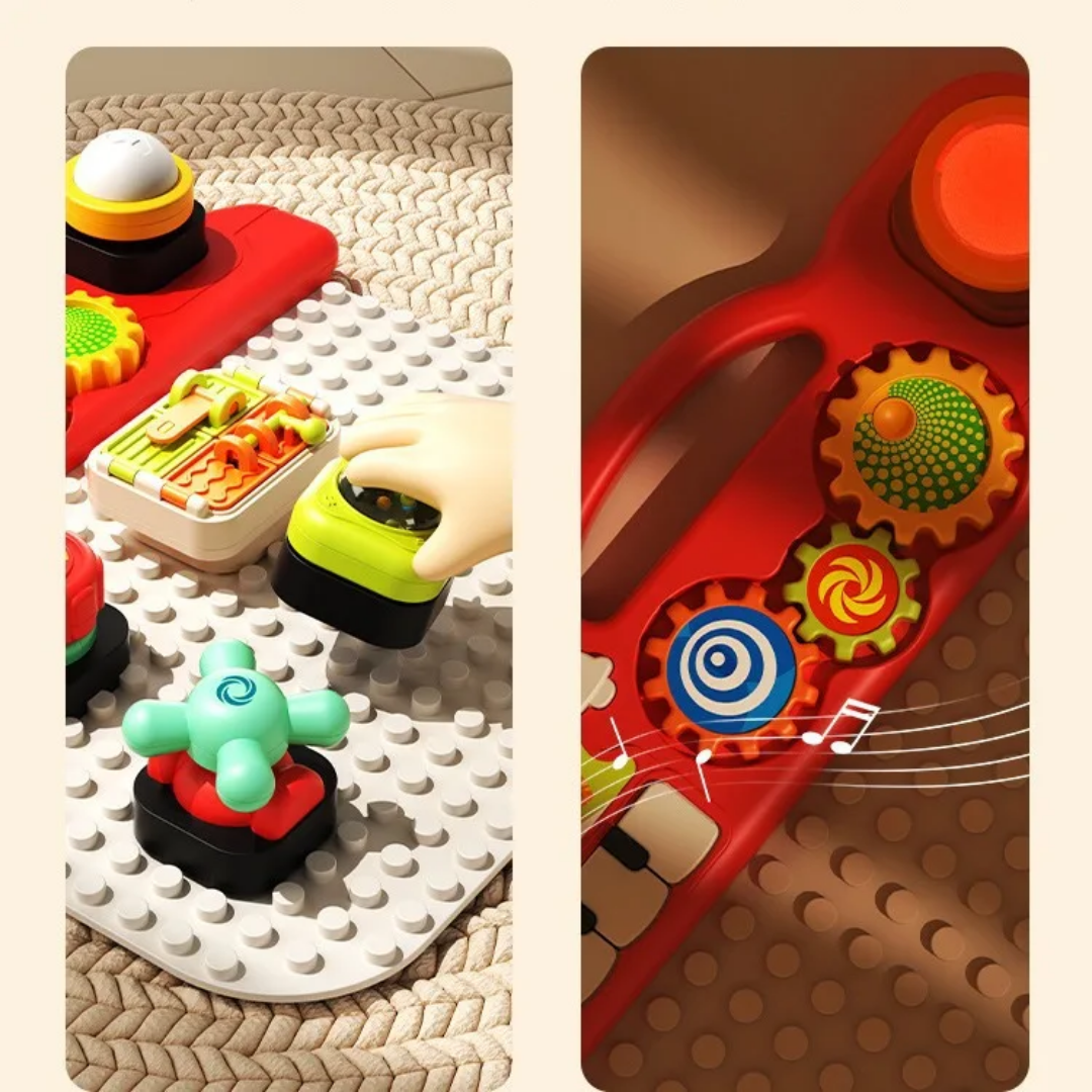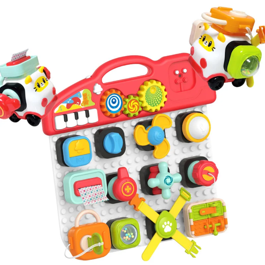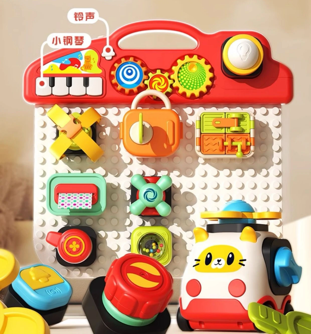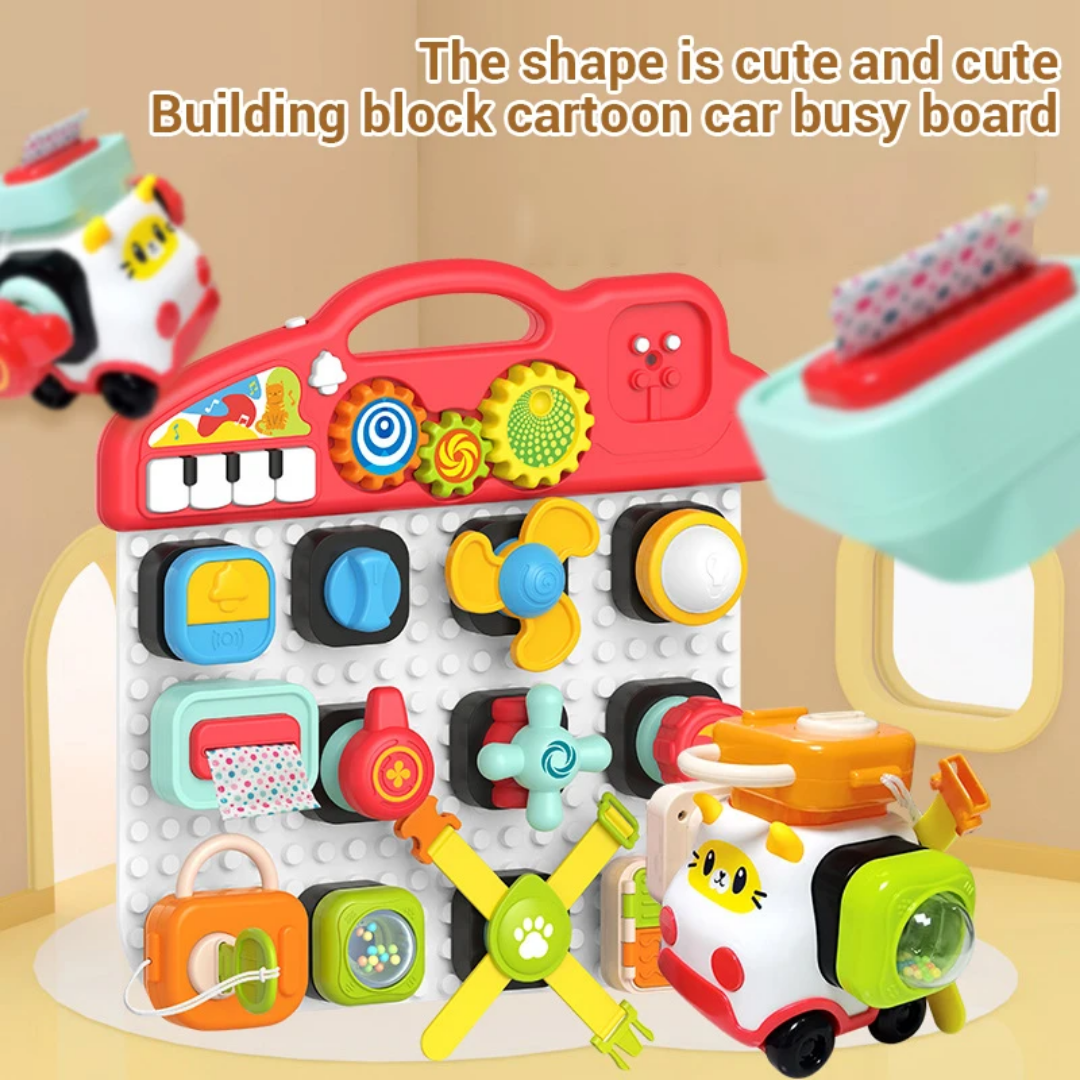 هر بلوک، یک بازی کوچک و جالب است! از لامپ و زنگ گرفته تا قفل و فرمان، همه و همه برای سرگرمی و یادگیری کودک طراحی شدهاند.