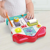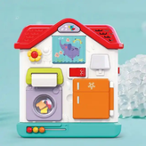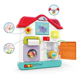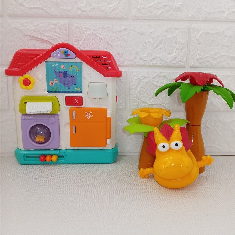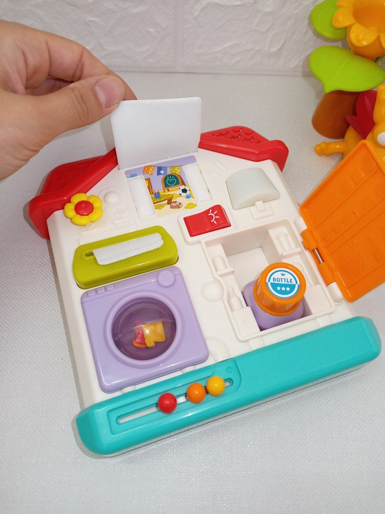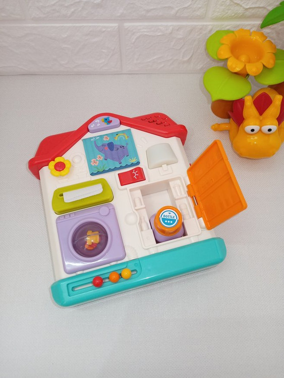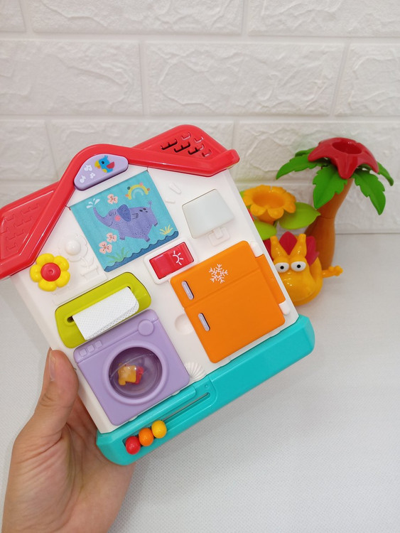 این خانه موزیکال با باتری کار می کند، پس ابتدا درب باتری در پشت اسباب بازی را باز کنید و باتری ها را در جای خود قرار دهید،حال دکمه روشن و خاموش قرمز رنگ کنار اسباب بازی را روشن کنید.
